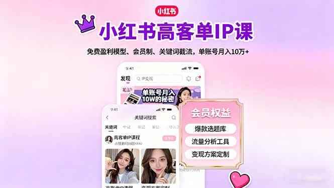 本课程为小红书高客单咨询师IP打造体系,涵盖流量获取、商业闭环、变现设计三大核心模块。通过20+实战案例拆解免费盈利模式、会员制设计、沙龙变现等策略,结合关键词截流、万能营销公式等工具,帮助学员实现单客单价1.98万-10万,月收入30万-100万的商业目标。